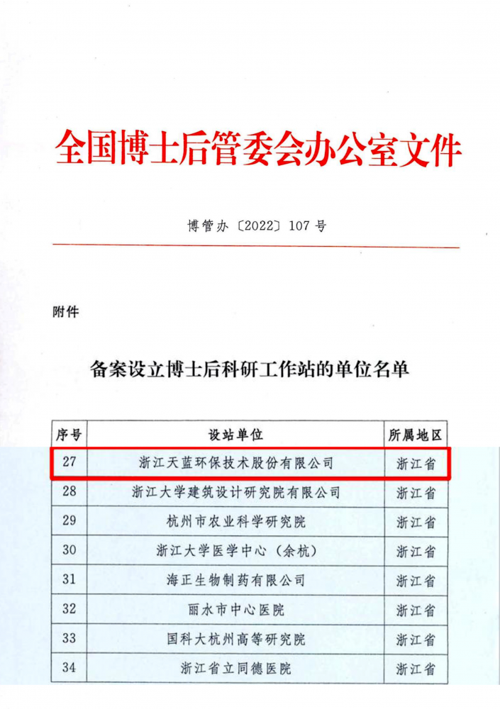 浙江天藍環(huán)保技術(shù)股份有限公司獲批國家級博士后工作站,標(biāo)志著天藍環(huán)保在人才隊伍、技術(shù)創(chuàng)新和科研平臺建設(shè)上的重大突破。