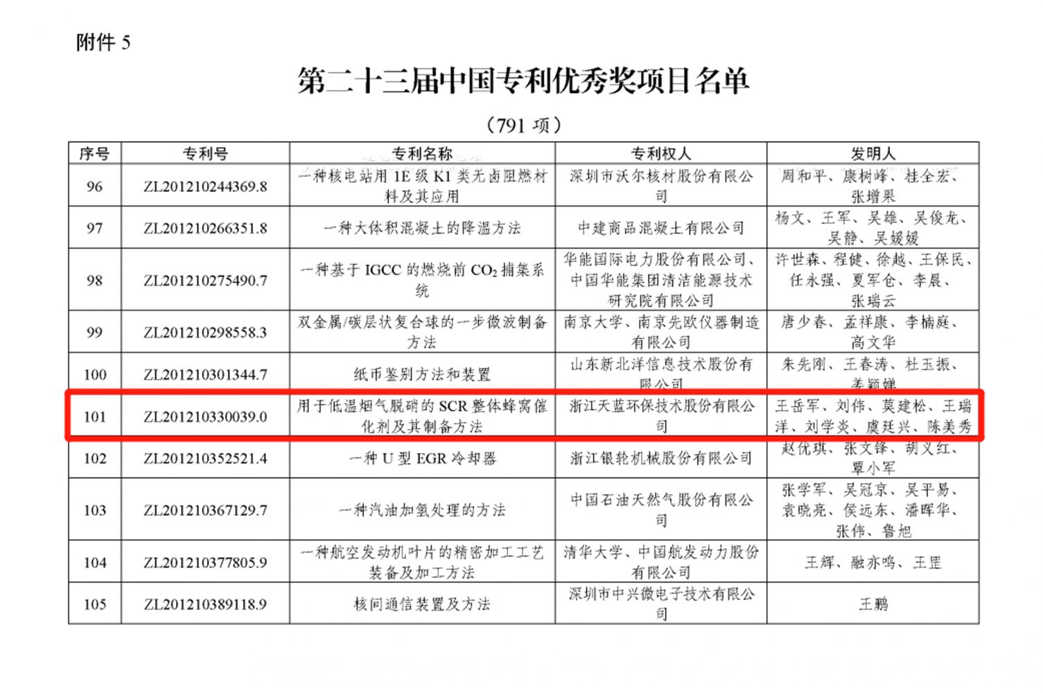 在剛剛揭曉的第二十三屆中國專利獎中,我司發(fā)明專利“用于低溫?zé)煔饷撓醯腟CR整體蜂窩催化劑及其制備方法”榮獲中國專利獎優(yōu)秀獎。