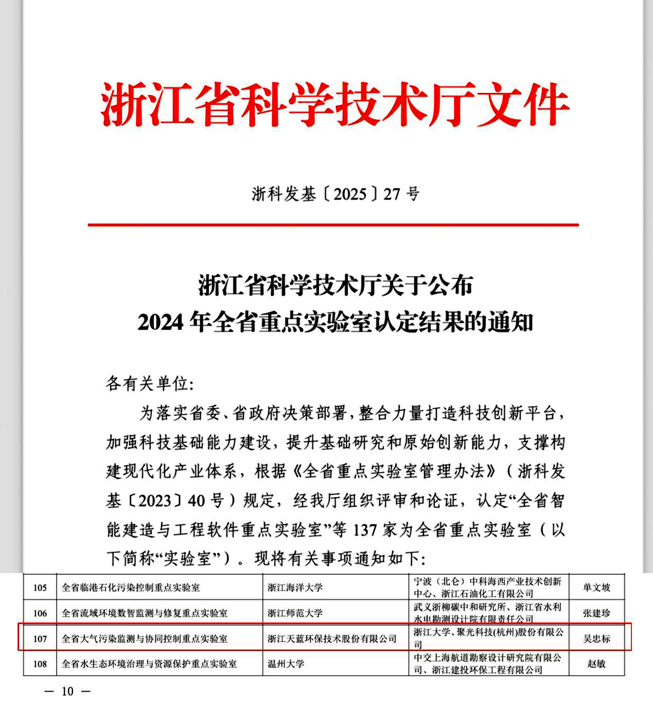 2025年6月4日,浙江省科技廳發(fā)布《浙江省科學(xué)技術(shù)廳關(guān)于公布2024 年全省重點實驗室認(rèn)定結(jié)果的通知(浙科發(fā)基〔2025〕27號)》,由浙江天藍環(huán)保技術(shù)股份有限公司牽頭,浙江大學(xué)和聚光科技(杭州)股份有限公司共建的“全省大氣污染監(jiān)測與協(xié)同控制重點實驗室”獲批組建,成為全省環(huán)境領(lǐng)域唯一以企業(yè)牽頭建設(shè)的省級重點實驗室